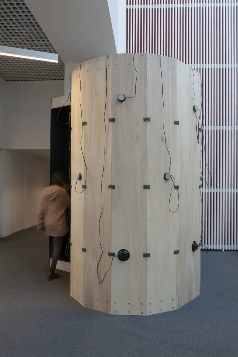 Des troncs d’arbres disposés à l’intérieur du cylindre diffusent des compositions sonores permettant d’écouter la vie foisonnante et invisible qui existe sous nos pieds. Ce projet scientifique et artistique vise à sensibiliser et à rendre la recherche scientifique plus accessible, en éveillant une prise de conscience sur la richesse des écosystèmes souterrains et leur vulnérabilité face aux pressions humaines.